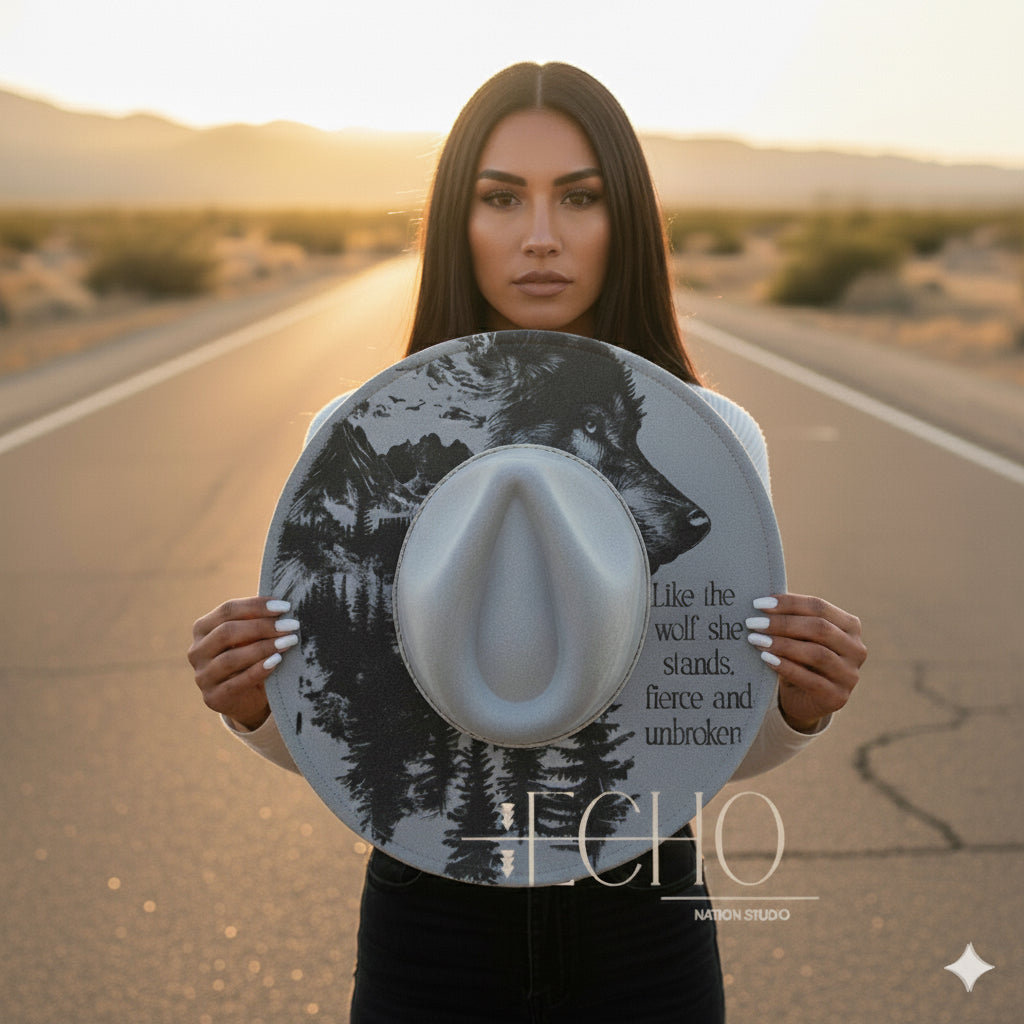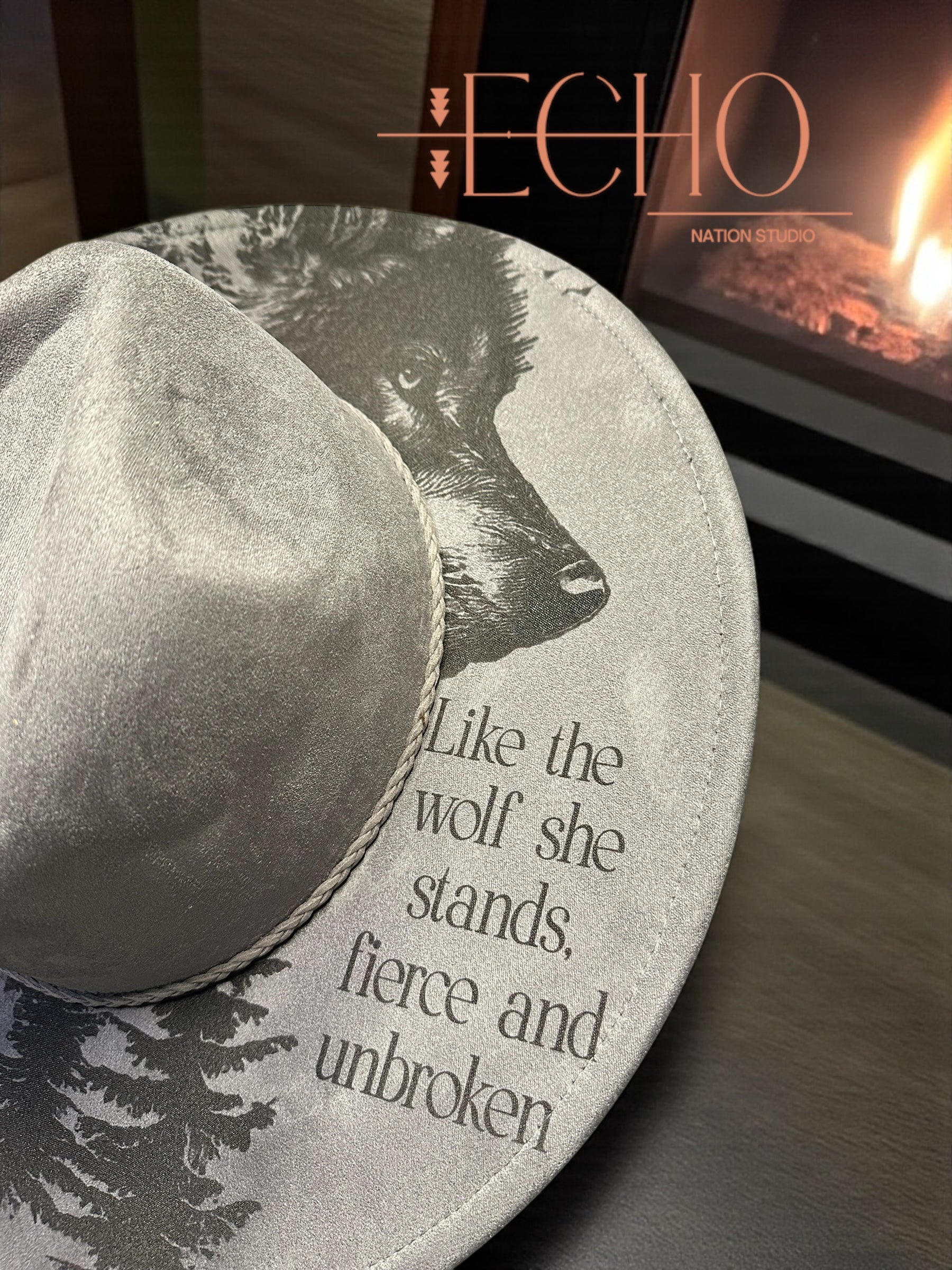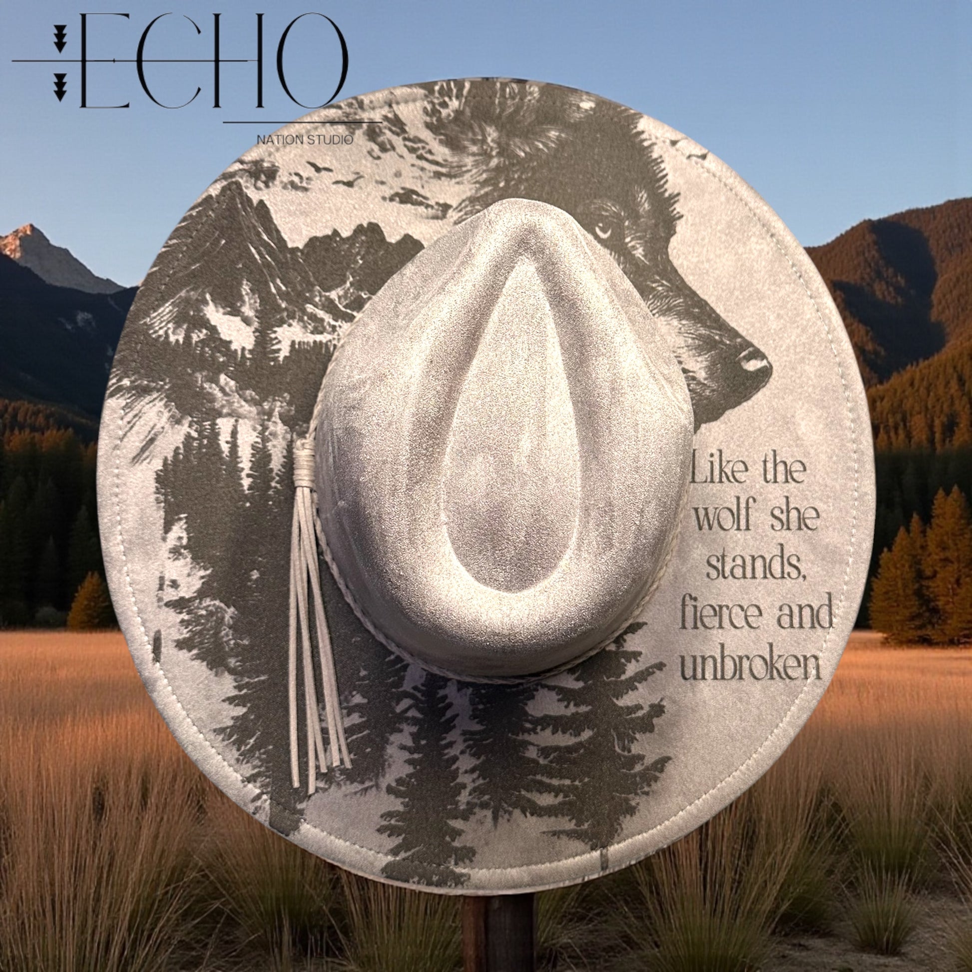 Wolf Energy Engraved Vegan Suede Wide Brim Fedora