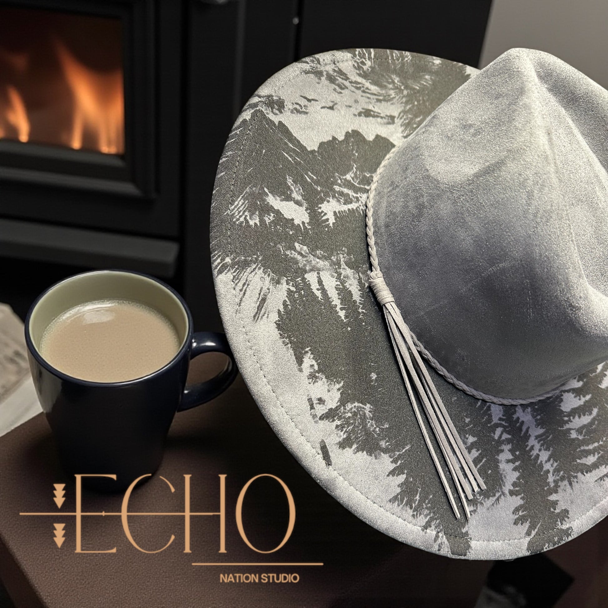This unique vegan suede wide brim fedora hat features a full brim laser engraving. The artwork covers the entire brim and creates a detailed outdoor scene that stands out when worn or displayed. This hat includes comes with a matching faux suede hat band.